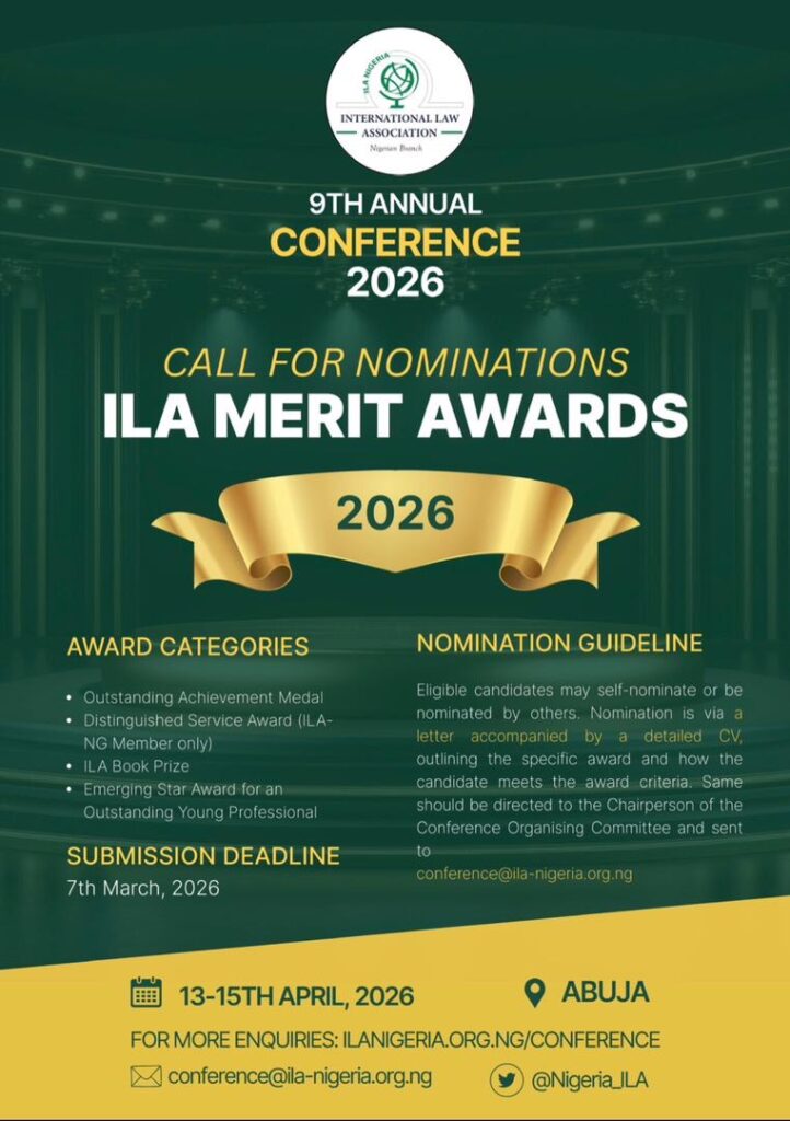 International Law Association, Nigerian Branch will present four categories of awards to international law practitioners and scholars that have demonstrated outstanding achievement, leadership, and distinction in international law. The awards will be presented at the 9th Annual Conference of the Branch on April 13-15, 2026 in Abuja.